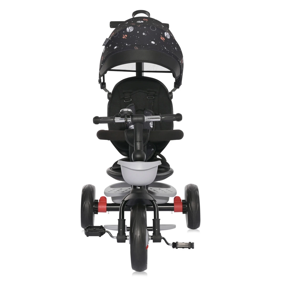 Je kunt gemakkelijk de zonnekap vastmaken aan het stoeltje, dit is erg handig voor buiten! Het zachte rubberen stuurtje heeft een belletje waar je kleine leuk mee kan rinkelen en de zonnekap heeft een mooie print van planeten en sterren, dit maakt de driewieler helemaal af!Â